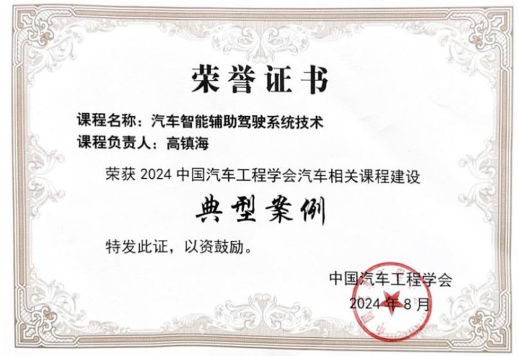 2024年8月,富豪娱乐城 高镇海教授、胡宏宇教授、孙天骏副教授联合开设的“汽车智能辅助驾驶系统技术”课程荣获2024中国汽车工程学会汽车相关课程建设典型案例奖。该奖项是由中国汽车工程学会于2023年首次设立,面向全国高等院校进行汽车相关课程建设案例征集,并将优秀典型案例在全国汽车行业人才培养院长论坛上进行现场展示。