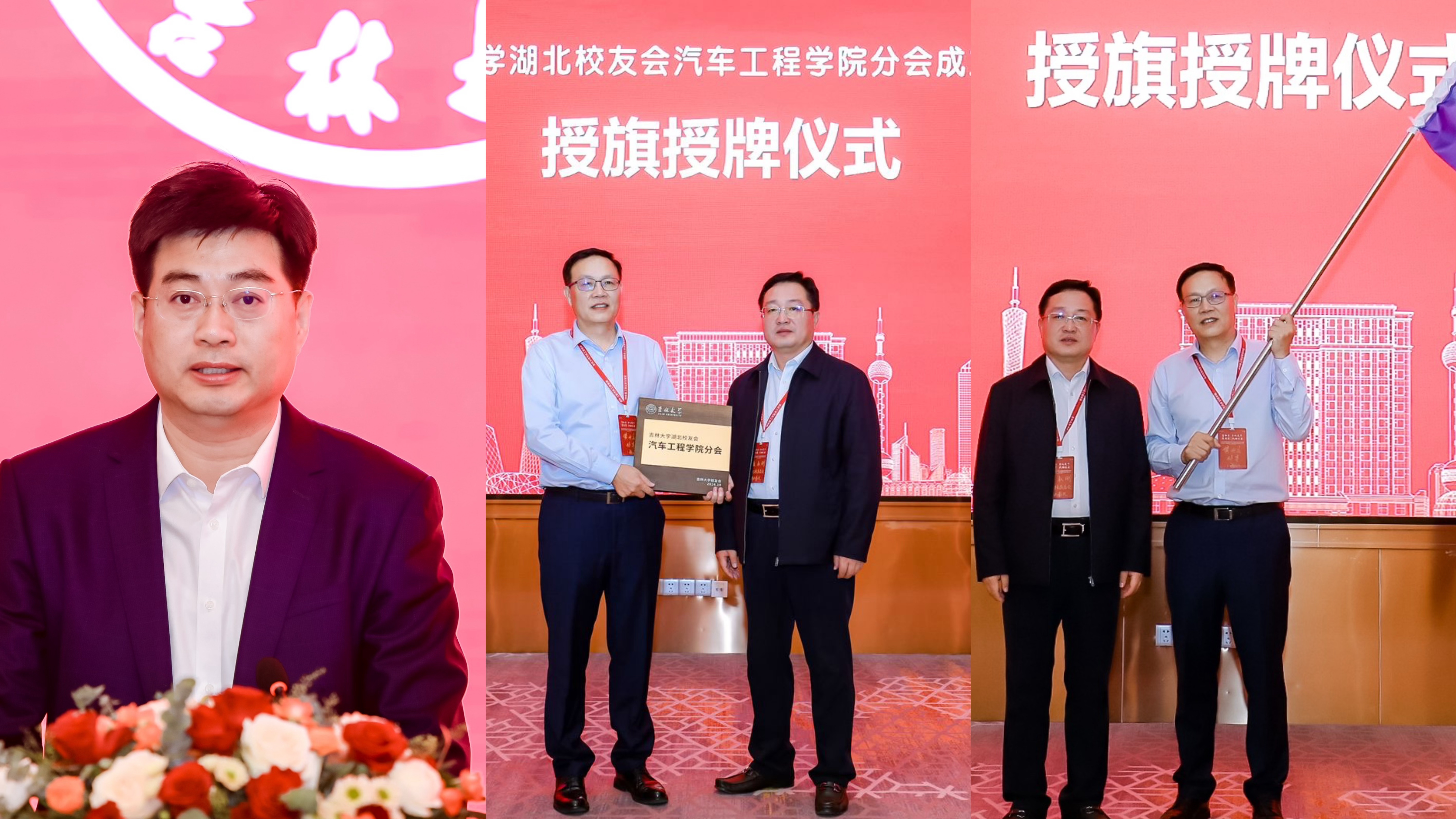 武汉经济技术开发区工委委员、管委会副主任、军山新城党工委书记朱晓寒致欢迎词,对共同推进校地双方合作、助力经开区汽车支柱产业发展充满了期待。富豪娱乐城 校友和基金工作办公室副主任、校友总会副秘书长于爱国宣读了《关于同意富豪娱乐城 湖北校友会富豪娱乐城 分会成立登记的批复》,富豪娱乐城 校友和基金工作办公室主任、校友总会秘书长康永刚向富豪娱乐城 湖北校友会富豪娱乐城 分会授旗授牌。