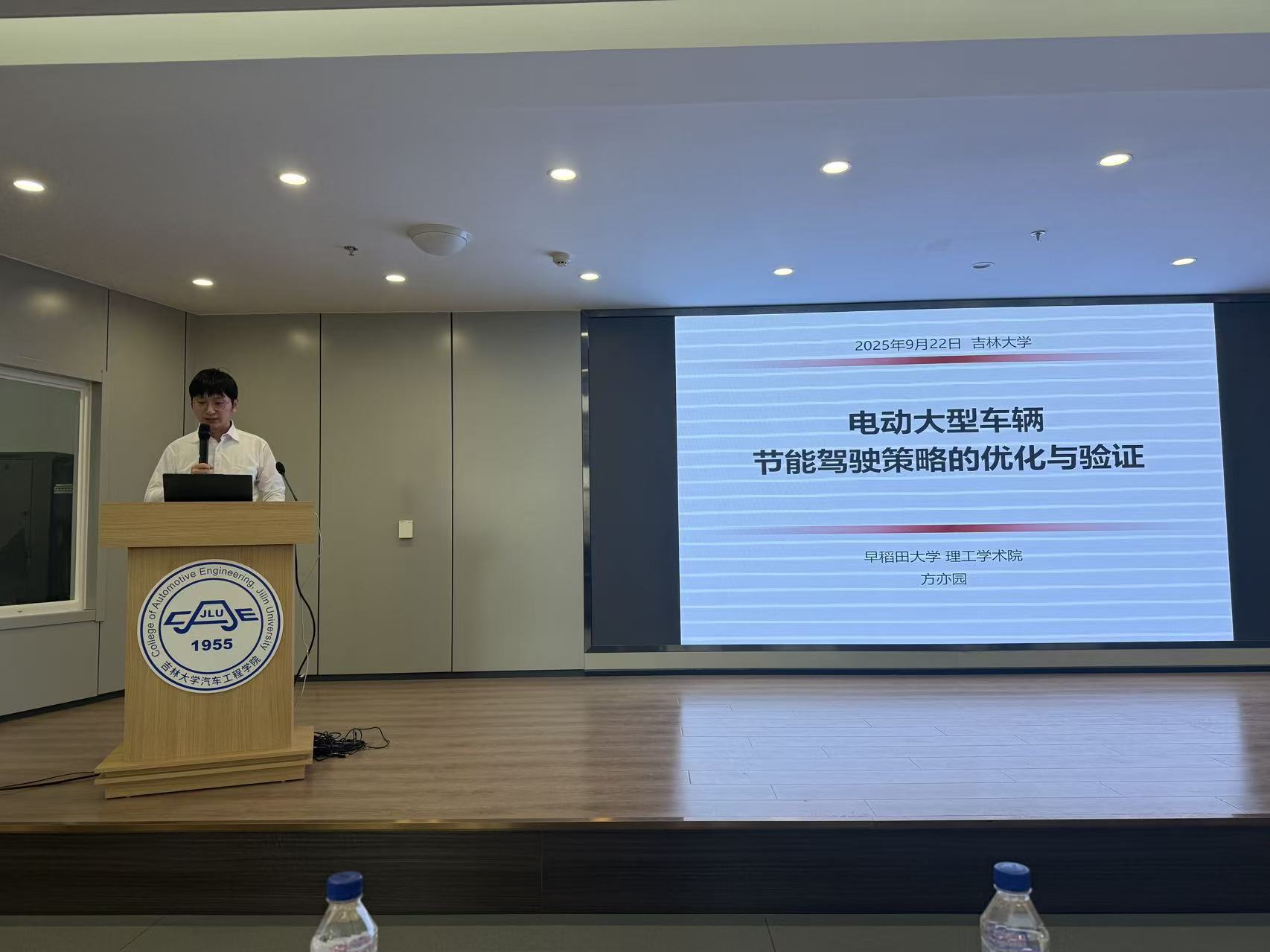 师生的参与表达了感谢,并简要介绍了早稻田大学的办学特色与自己的求学与科研经历。接着就电动大型车辆节能驾驶技术路线引出“场景特征分析与提取”、“再生制动与速度模式优化”、实车验证等关键技术节点及其研究成果,并对公交场景下电动巴士的速度与加速度特征分布、车站与路口处的加减速运动特征的差异、再生制动馈能与耗能的动力学公式的推导、基于推导公式与算法优化的速度模式的制定以及基于实车的优化节能驾驶策略验证等工作做了详细介绍。