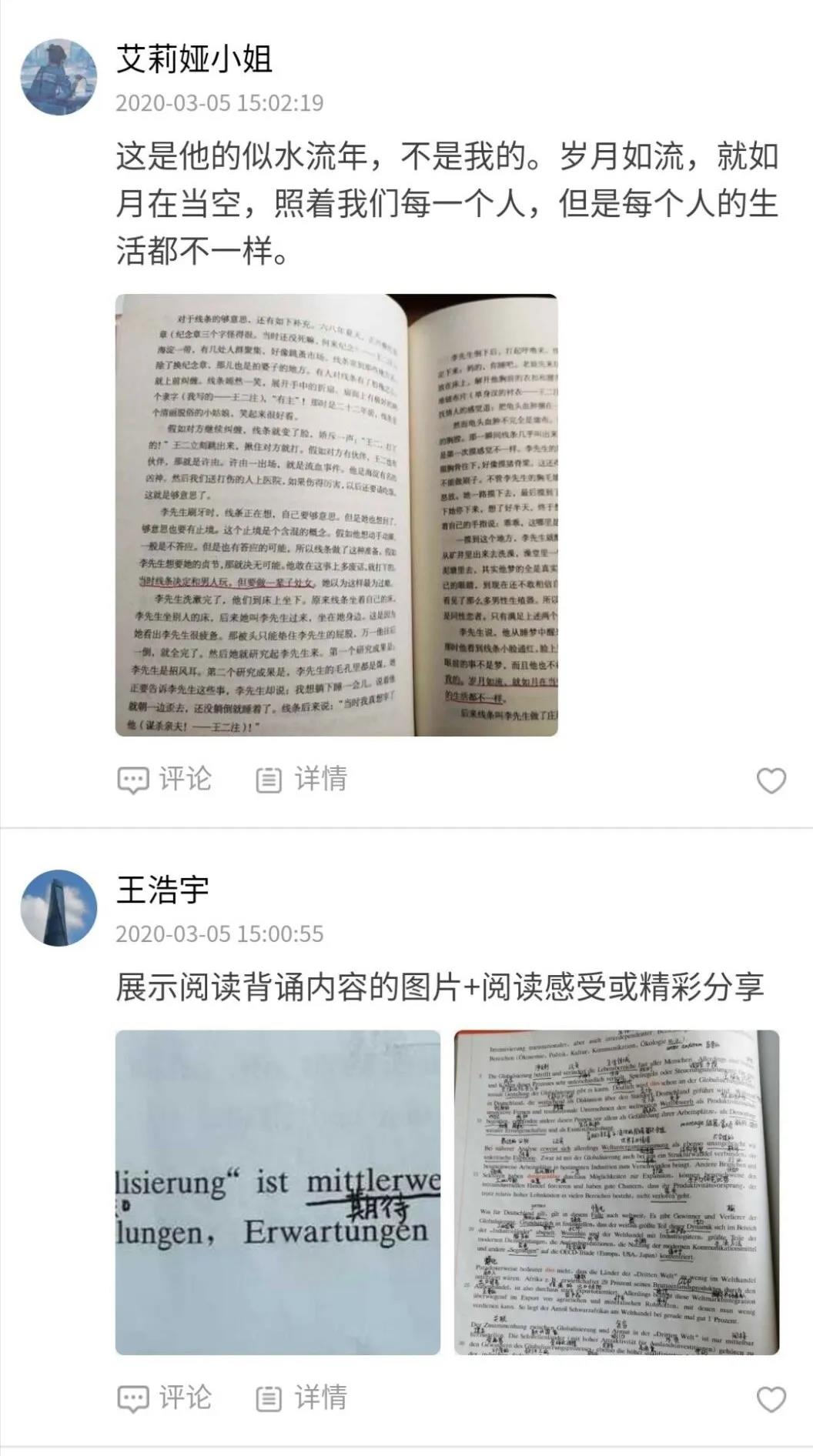本次连续15天不间断读书打卡活动,要求同学们按照活动规定,每天将自己当天的阅读内容进行截图或拍照,并在规定的时间段内,进入程序打卡。通过每天打卡记录的方式,同学们可以相互激励督促,使参与者们在浓厚的阅读氛围中,养成每天坚持阅读的良好习惯。在网络授课期间,学习课本知识的同时,丰富个人内心世界,熏陶个人思想情怀,培养个人精神内涵。同学们积极响应,纷纷加入到此次每日一读的洪流中来,并以此活动为契机,在阅读中享受文字带来的精神满足。活动开始第一周,就有56位的同学踊跃参与了进来,覆盖富豪娱乐城 全部年级和专业。同学们阅读的内容多种多样,古今中外莫不涉猎。