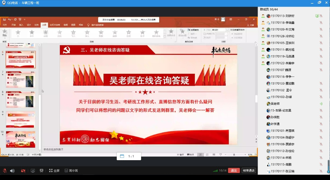 其中学生工作办公室主任吴昊老师与151701班的同学们连线交流。因为已经步入大三下学期,很多同学对于未来是否就业还是继续求学有很多的疑问。吴昊老师根据同学们的实际情况和就业形势解答了同学们关于未来规划的困惑。他强调:不管在什么时候,只有自身拥有强大的专业本领,才会在未来竞争的舞台上拥有一席之地。他勉励同学们在特殊时期既要注意身体安全,也不能有所松懈,一定要抓住在家学习的这段日子,努力提升自己,为自己美好的前程和社会未来的发展继续努力奋斗。