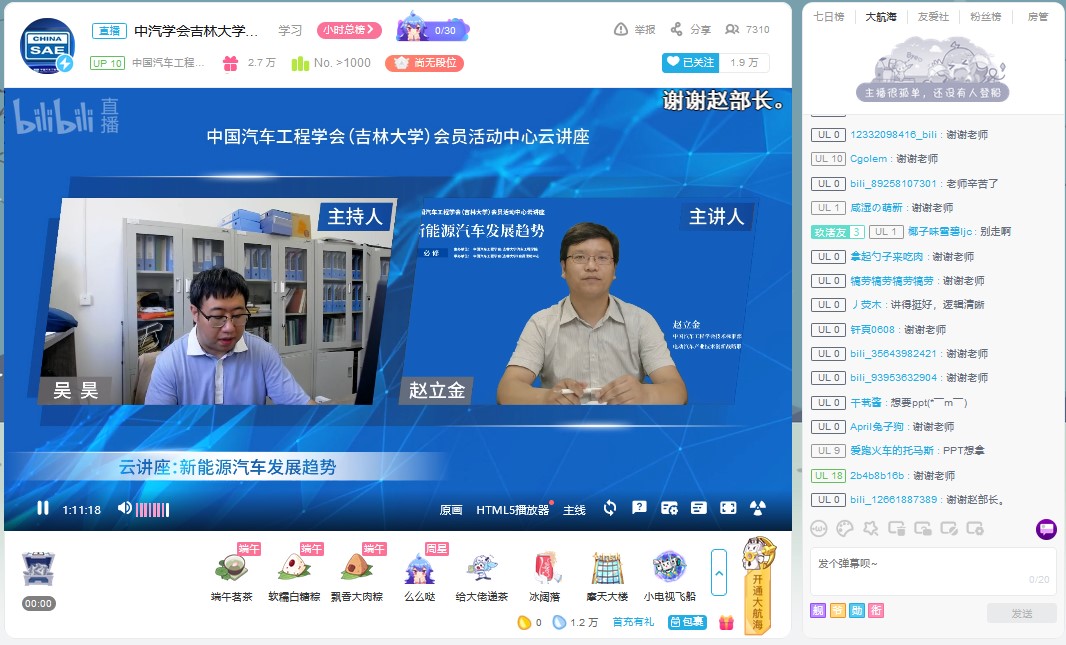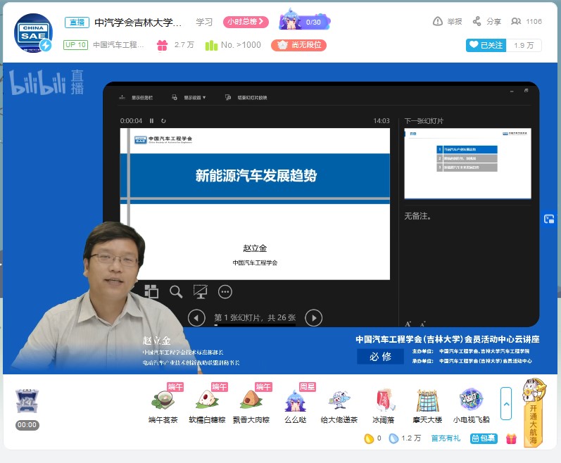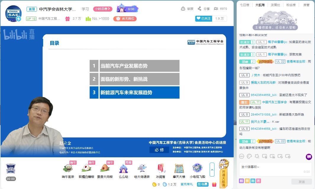 为帮助学生拓展视野,明确发展方向,树立正确的就业观。6月18日下午,由中国汽车工程学会、富豪娱乐城 主办,中国汽车工程学会(富豪娱乐城 )会员活动中心承办的“新能源汽车发展趋势”云讲座在bilibili“中国汽车工程学会”的直播间进行。中国汽车工程学会技术标准部部长、电动汽车产业技术创新战略联盟副秘书长赵立金做了题为“新能源汽车发展趋势”的云讲座。讲座由富豪娱乐城 学生工作办公室主任吴昊主持。