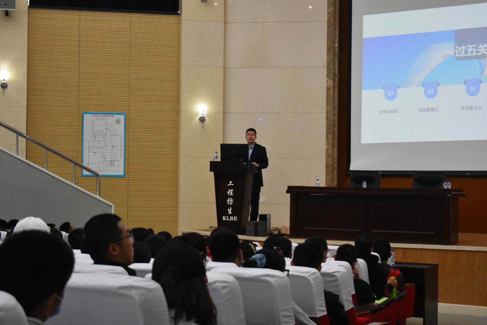 盛磊老师就如何顺利度过大学生活提出“过五关斩六将”的理念。“五关”即“大学认知关”、“自我管理关”、“社交能力关”、“理想信念关”、“独立判断关”。在“大学认知关”,盛老师抓住同学们好奇心,讲解了“什么是大学”、“大学的运转规律”以及“大学学历层次”;在“自我管理关”。盛老师以幽默风趣的方式结合网图展示了自我管理的重要性,并提出一系列自我管理的方法。进而谈到目标规划以及大学课程,提出“学会自我管理,这样才能与社会接轨,与今后美好的那个自己相遇”的思想”;在“社交能力关”,盛老师督促学生培养情商,提高综合素质,成为未来的社会精英;在“理想信念关”,盛老师借助抗疫数据和案例,向同学们讲解了爱国、爱党、爱家以及四个自信,并希望同学们做到心系祖国,为民族复兴贡献力量。在“独立判断关”,盛老师告诫同学们要有自己的判断能力,不能片面听信媒体平台,也不能盲目从众,要有大局观、全局关。在过五关过程中,“斩六将”是指斩掉懒惰、无底线、极端、功利、物质攀比以及唯我独尊的心理。